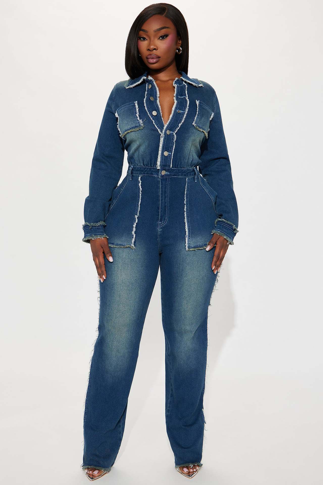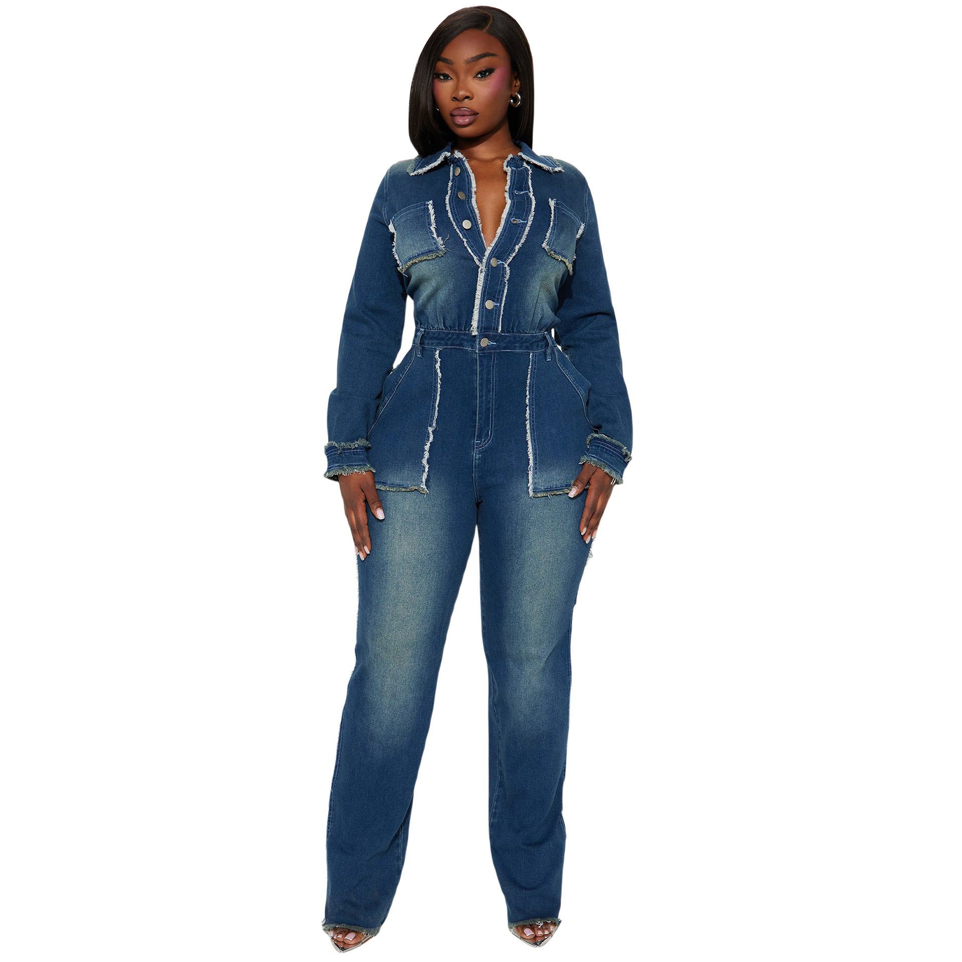 Slim fit elastic trumpet long sleeved denim jumpsuit